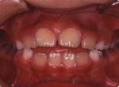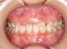 発音や嚥下時に舌が突出する癖をもつお子様に見られます。この癖により前歯が前方へ押し出されてしまい、前歯で咬めない状態です。装置で強制的に舌が出ないようにし、トレーニング・マニュアルを用いて正しい発音や飲みこみ方を覚えてもらいます。