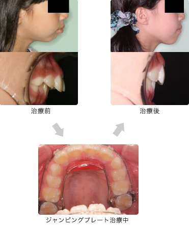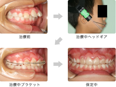 治療方法としては、上のあごの成長抑制、奥歯の後方移動に伴う前歯の後方移動があげられます。
